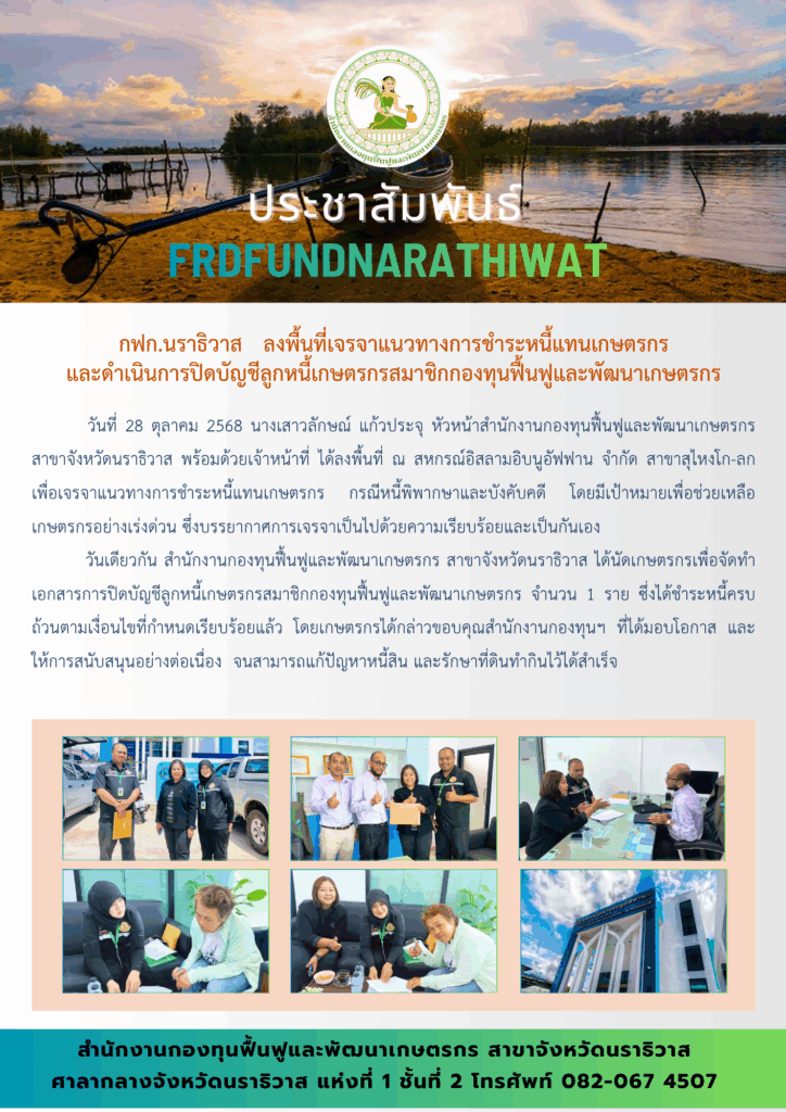 วันที่ 28 ตุลาคม 2568 นางเสาวลักษณ์ แก้วประจุ หัวหน้าสำนักงานกองทุนฟื้นฟูและพัฒนาเกษตรกร สาขาจังหวัดนราธิวาส พร้อมด้วยเจ้าหน้าที่ ได้ลงพื้นที่ ณ สหกรณ์อิสลามอิบนูอัฟฟาน จำกัด สาขาสุไหงโก-ลก เพื่อเจรจาแนวทางการชำระหนี้แทนเกษตรกร กรณีหนี้พิพากษาและบังคับคดี โดยมีเป้าหมายเพื่อช่วยเหลือเกษตรกรอย่างเร่งด่วน ซึ่งบรรยากาศการเจรจาเป็นไปด้วยความเรียบร้อยและเป็นกันเอง